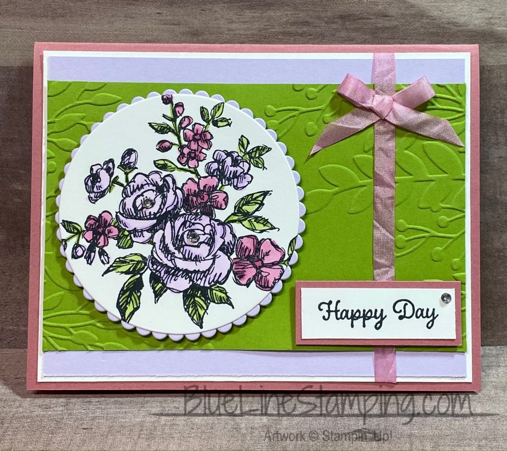 The embossed layer of Granny Apple Green was made using the Greenery Embossing Folders. This is a set of two that will work with the Small Stampin’ Cut & Emboss Machine ( once it is available). The ribbon is the Crinkle White Seam Binding Ribbon that I colored using the Rococo Rose Light Stampin’ Blend. I really love this ribbon for that purpose! It colors so quickly and dries almost immediately.