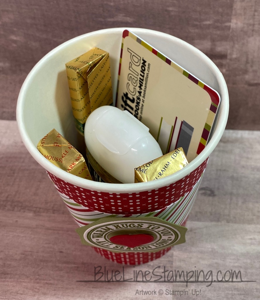 Not only are these products adorable, but they are very quick to make. I see these as great Hostess, Neighbor, Teacher, Co-worker, or just a Friend gift. The carrier comes in a pack of 8, as do the coffee cups and lids. The cups are the equivalent of a small coffee at a coffee shop or drive thru. So they hold quite a bit of goodness. Here is a view of one I filled with fun items.