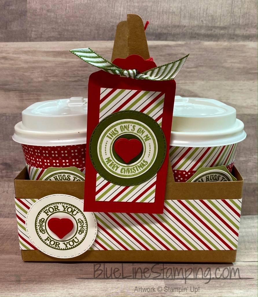 All of the round sentiments are from the Warm Hugs stamp set. There are a couple of different dies to cut them. I added the tag to the carrier by using the Fancy Tag Punch and the Real Red Braided Trim. The little added bow is the Mossy Meadow Diagonal Striped Ribbon. And since you have seen it several times lately since I LOVE it!!!!!, the DSP is the Heartwarming Hugs Designer Series Paper.