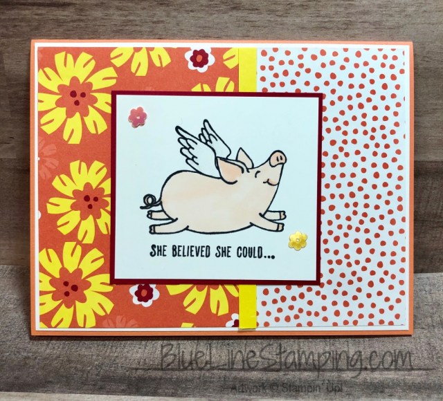 Back to the card!! I stamped the piggy and colored her with the Stampin’ Blends. You may not be able to see from the photograph, but I added Wink Of Stella to her wings. Wings should sparkle!! And that is pretty much it. I have the measurements for the DSP listed below.